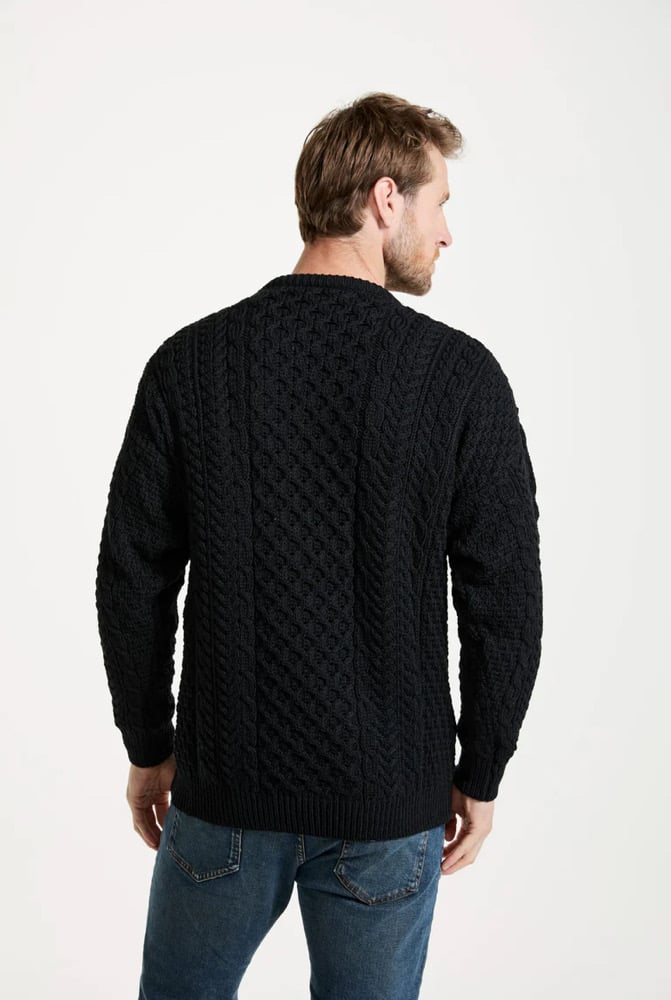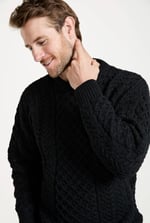 The ever popular Black Aran sweater - dress it up or down offering a modern edge. The main body of the sweater features the honeycomb stitch pattern.