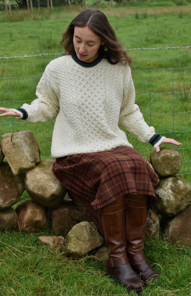 A new take on the classic Aran sweater. The sporty banding detail to the hem, collar and sleeves is a nod to the summer sports of tennis & cricket.